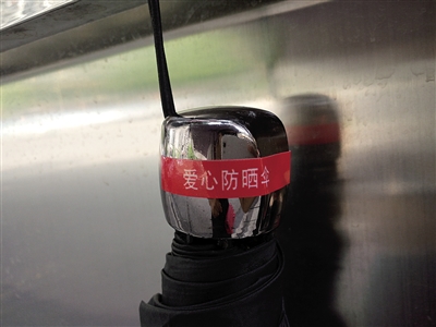 侯世鹏说,他和同事经常听到有乘客抱怨太阳大,又忘了带伞,就想到向乘客提供爱心太阳伞。