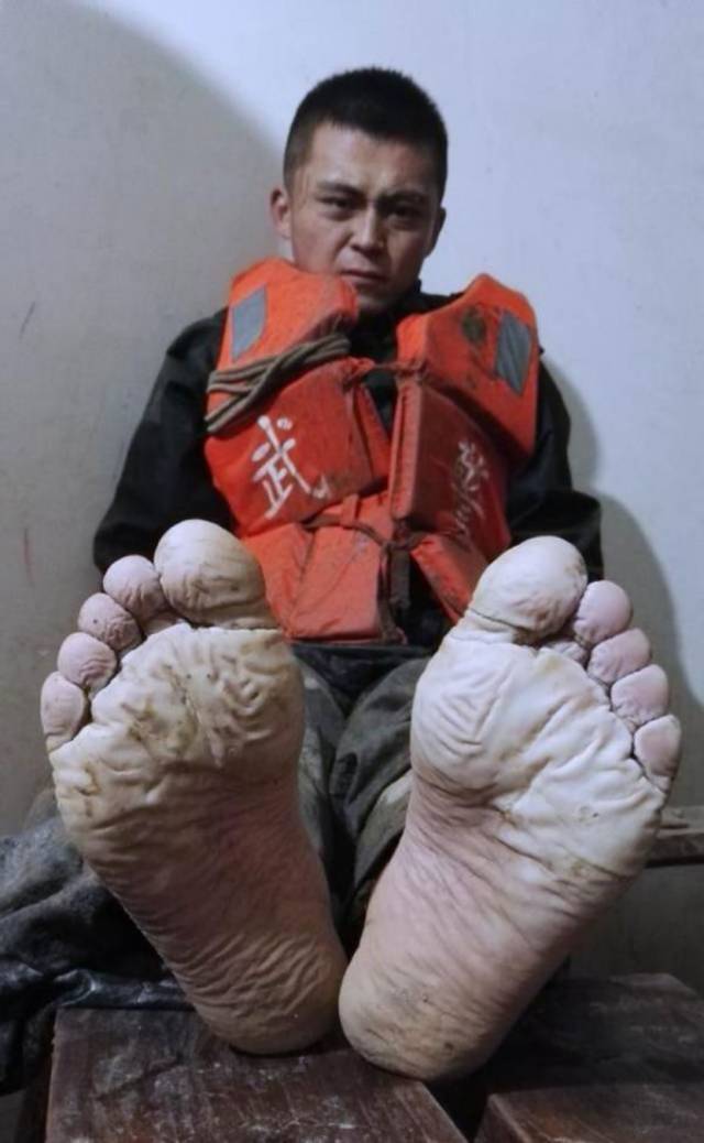 “一名年轻的安徽武警战士,眉头微蹙靠墙坐着,潮湿的救生衣,犹如未卸下的铠甲,沾满泥浆的迷彩裤筒,裹着一双被水泡的惨白、褶皱纵横的大脚,看上去随时都会‘皮肉分离’。”