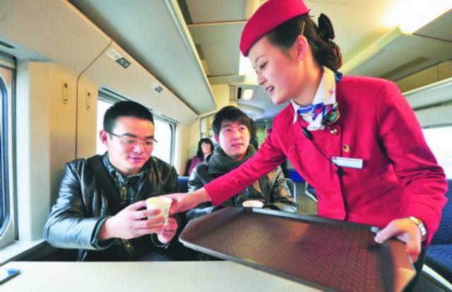 春节期间,武汉动车乘务员武斯琦为乘客倒水。