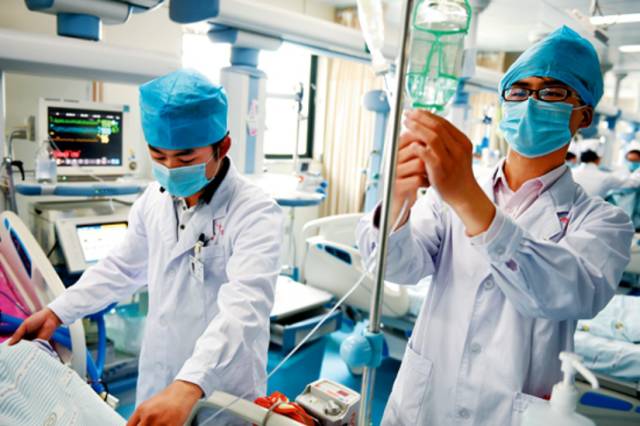 安徽亳州市人民医院重症监护室(ICU)内,“90后”男护士闫保国(右)和王彪正忙着为患者翻身、量血压、更换输液药物等。
