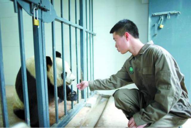 中国保护大熊猫研究中心都江堰基地内,90后“熊猫奶爸”刘怀庭正在工作。