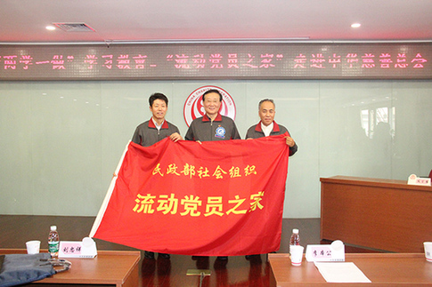 中华慈善总会会长兼“两学一做”领导小组组长李本公(中)、民间组织服务中心党委书记刘忠祥(右一)将民政部社会组织“流动党员之家”旗帜交给中国社会工作联合会。