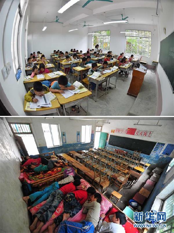 拼版照片:上图为10月10日,同学们在新教室内上课;下图为曾经混在一起的教室宿舍,教室后面安置床架作为学生宿舍(2012年5月30日摄)。新华社记者黄孝邦 摄