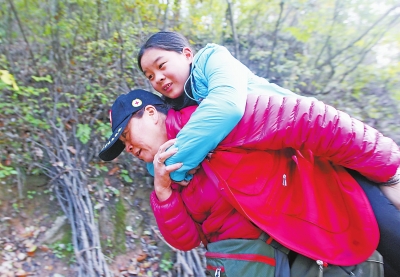 栾川县庙子镇龙王幢村13岁的李妮妮脚上有伤,爷爷奶奶用两轮车推着妮妮去镇上换药回来,刚好碰到来看望他们的张菊等人。上陡坡时,张菊背着13岁的妮妮走。记者许俊文摄影