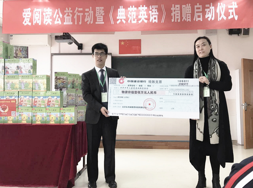 活动上,中华儿慈会爱健康专项基金主任商相芹作为代表接收了北京弘书阁教育科技有限公司捐赠的100万元(注:首批捐赠《典范英语·大字本》系列图书15万余册,价值100万元)支票。中华儿慈会副秘书长姜莹与爱健康专项基金主任商相芹共同为北京弘书阁教育科技有限公司颁发捐赠证书,以感谢爱心企业对于儿童成长的深切关怀与无私捐赠。