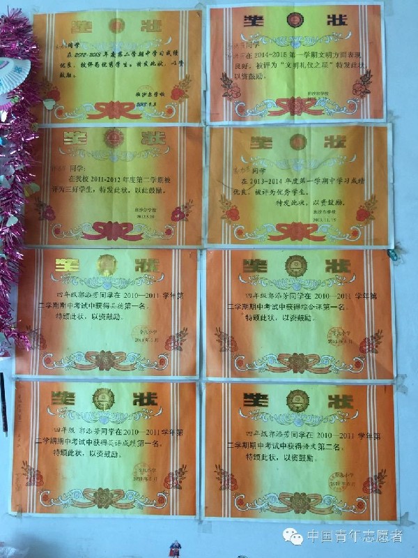 但提到她的孙子时,又仿佛眼里会发光,喜不自禁地向我们展示贴满了整面墙的奖状和学校奖励的各式各样的本子。当我们离开的时候,她一直送我们下山,那注视着我们逐渐离去的目光,重若千钧。