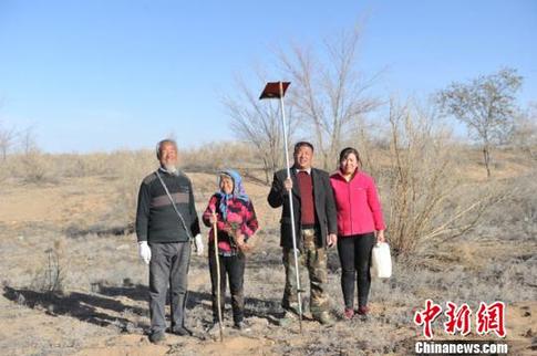 在基本生存条件都难以保障的中国腾格里沙漠腹地,76岁的王天昌和他48岁的儿子王银吉携家带口坚守了30多年,通过人力造成7500亩(约合680个标准足球场)沙漠“绿洲”。图为王天昌一家两代四口人。杨艳敏摄