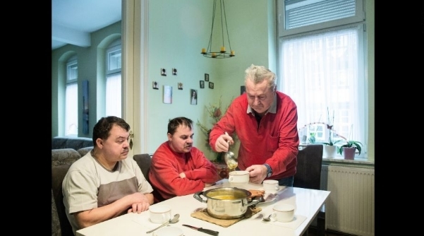 Waldthausen表示他们很喜欢自己的安排,生活中大部分事情都可以独立完成——穿衣,整理床铺以及自己做饭吃。看护人员则会陪着他们做一些活动,例如游泳或者骑马。图为两兄弟在家与父母一起共进午餐。