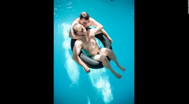 大多是盲聋人士“很少或者没有‘真正’的关系”,Waldthausen表示她很害怕不能向他们表达清楚自己的意思。图为J rg推着Rolf在泳池里接受每周一次的治疗。