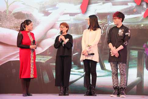 中华社会救助基金会副秘书长张雪雁(左二)、著名作家苏芩(右二)、流行歌手丁克森(右一)、凤凰公益主编孙雪梅现场互动