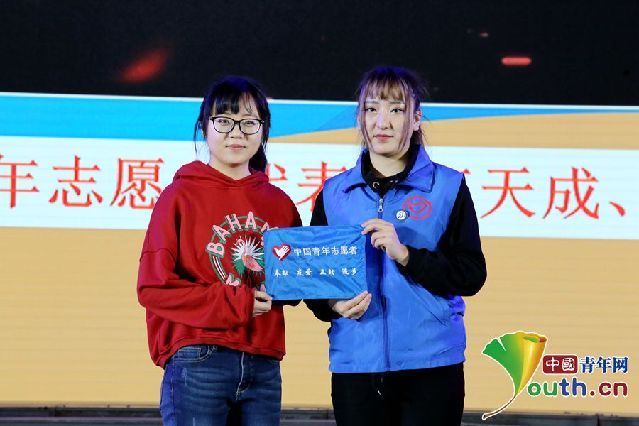 中国航天科技集团第五研究院508所“巡天”志愿者代表蒙佳与现场青年代表展示“中国青年志愿者飞天旗帜”样旗。中国青年网特约记者马慧娟摄