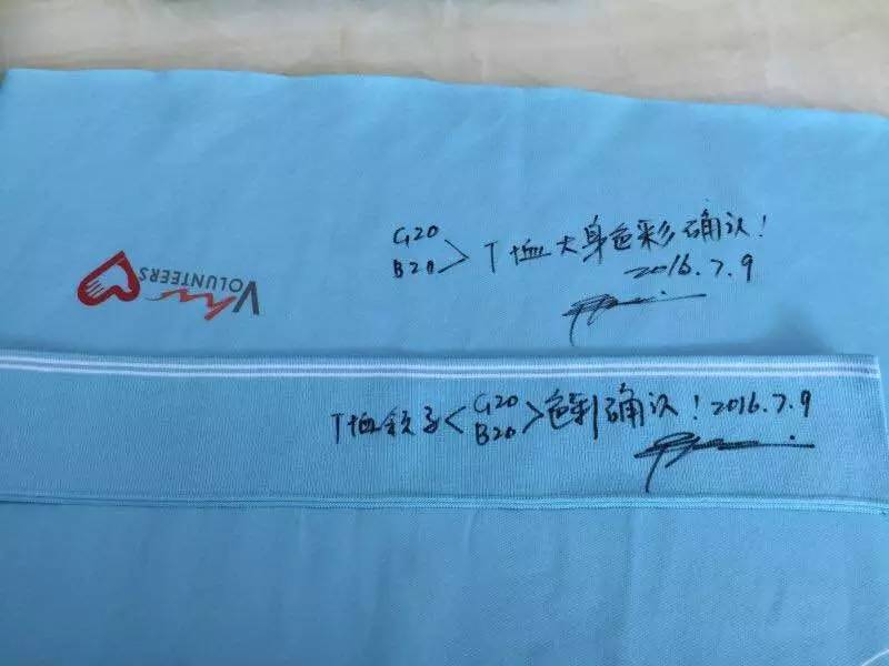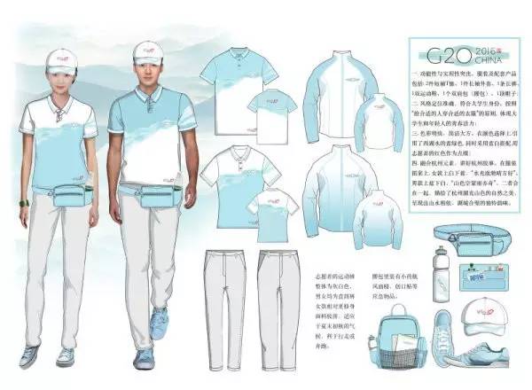 杭州位于世界级六大城市群之一——长江三角洲城市群的中心,国家级历史文化名城,国际花园城市,作为G20峰会的重要视觉形象,志愿者服装的设计体现中国面向世界的态度——温雅有度与大气开放、个性活力与群体向上的和谐统一。杭州山水相依,湖城合璧,江、河、湖、海、溪五水共导。志愿者服装色彩创意定位为纯净的蓝色,它既是秋高气爽的西湖蓝,也是睿智兴盛的商务蓝、更是世界和谐的安全蓝,蓝白交相辉映,给世人以焕然一新的视觉享受。