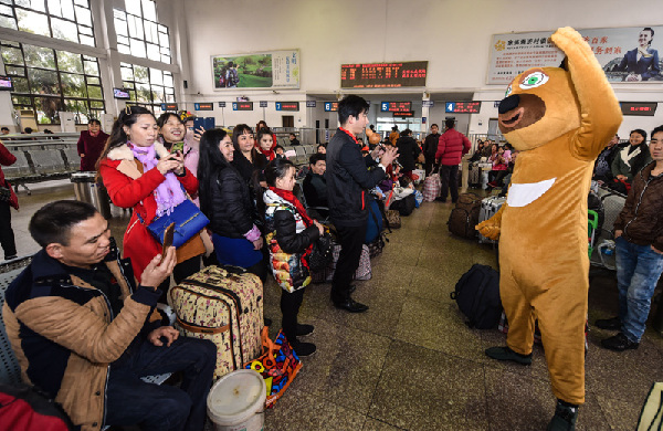 1月8日,“大城小爱”公益团体的志愿者们在余姚火车站为回乡的外来务工人员表演节目。