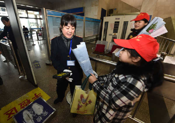 1月8日,“大城小爱”公益团体的志愿者们在余姚火车站把鲜花和慰问品送给值班的车站工作人员。