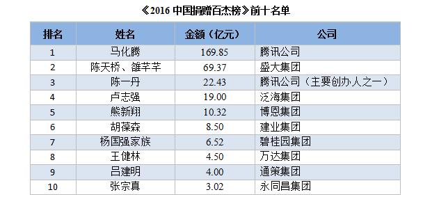 1月12日,北京师范大学中国公益研究院和深圳国际公益学院家族慈善传承中心在北京联合发布“2016中国捐赠百杰榜”。马化腾因承诺捐赠一亿股腾讯股票(价值169.85亿元)成为百杰榜新首善,陈天桥/雒芊芊夫妇、陈一丹、卢志强、熊新翔以超过十亿元的捐赠额进入榜单前五名。王健林、许家印、古润金连续6年上榜,陈经纬、卢志强、杨国强成为6年以来上榜5次的慈善家,而熊新翔等66位慈善家则在2016年度首次入榜。