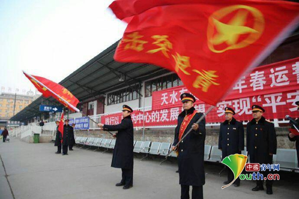 兰州铁路局天水车站春运誓师大会,“青年突击队”接旗。