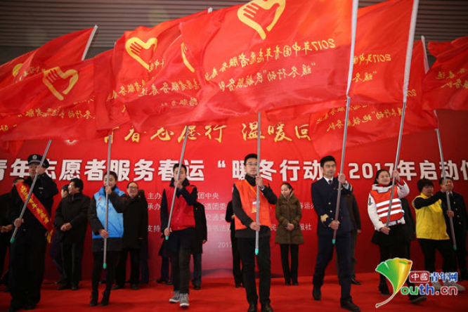 2017年中国青年志愿者服务春运“暖冬行动”在上海虹桥火车站启动。