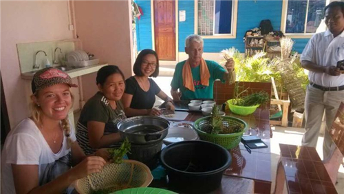 在柬埔寨,李欣(左三)与来自美国和瑞典等国家的国际义工一起学习做柬埔寨菜(受访者供图)