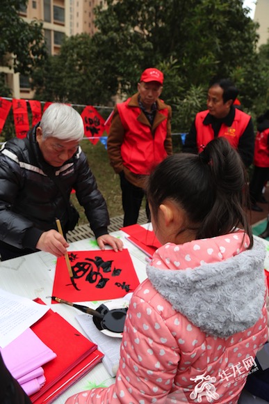 志愿者为公租房小区居民写春联、送春联。市公租房管理局供图,华龙网发