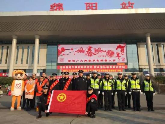 春运首日,绵阳车站广场前已是人潮涌动,售票大厅内,开放的8个窗口前都排着长队,有的甚至已经排到了门口。在火车站各区域,身穿小黄衣的志愿者正耐心地为乘客答疑解难。在志愿者服务点,开水、药品、导乘资料等一应俱全,志愿者全天候为乘客提供服务。同时,候车厅、站前广场、公交车站都安排了警力巡逻,乘车、购票、进出站秩序井然。