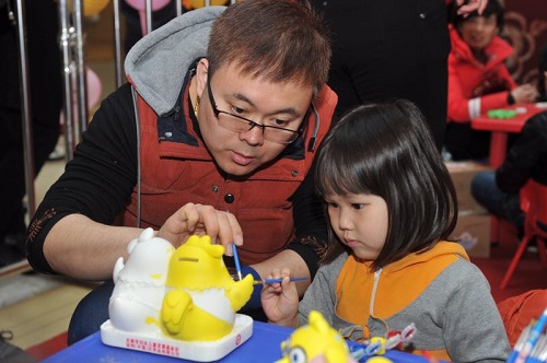 在活动现场,记者看到许多家长带着孩子认购了一个纯白色的生肖鸡储蓄罐,并且和孩子一起涂鸦完成。现场小朋友们专心创作,在完成作品后开心地与家长一起合影并写下自己的爱心寄语。