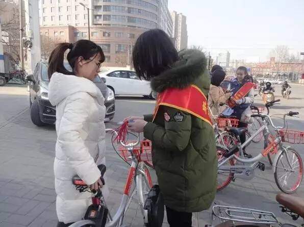 2月12日,同学们首先来到济南市和谐广场,将设计好的“共享单车 文明济南”、“绿色出行筑梦济南蓝”的心形宣传卡,把卡片发给行人,系在单车上,让每一个使用者切身感受这种文明的氛围。在摆放杂乱的单车停放点,同学们将单车进行了有序排列,把靠在路边树上的单车重新归位。活动受到了过往行人的广泛关注,同学们一边给大家讲解使用单车的注意问题,一边沿路发放了“低碳出行,文明交通”倡议书,号召市民绿色出行,文明出行。