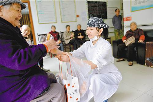 感人片段:在大渡口区新山村心怡老年人照料中心,每天都有身着白色工作服的年轻人提来两大包糕点。2014年9月,湖北荆州人王红星在新山村街道开了一家蛋糕店后,每天都会额外烘焙40份老年人爱吃的糕点,并吩咐员工取掉留有蛋糕店名字和地址的包装盒,与新山村街道爱心办公室工作人员一起送去托老所,40位老人每人都有一份。