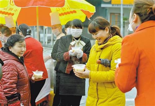 渝北区回兴街道双湖路,龙凤橼大酒楼的工作人员将煮好的爱心粥分发给过路的老人。记者 崔力 摄