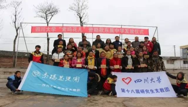 自2009年起,四川大学研究生支教团便启动了“索玛花儿”扶贫助学计划,该计划直接引入资金和物资,以助学款为主要形式对品学兼优的贫困学生进行资助。采用“一帮一”、“多帮一”、“多帮多”等形式。由支教团的成员们搭建桥梁,以学期为单位资助品学兼优、家庭贫困的孩子完成学业。