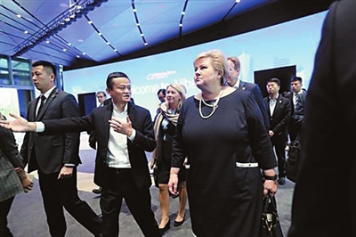 4月9日,马云在杭州阿里巴巴园区接待了一位特殊的“同事”——和他一同担任“联合国可持续发展目标倡导者”的挪威女首相埃尔娜·索尔贝格。