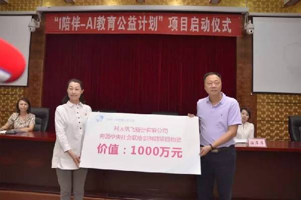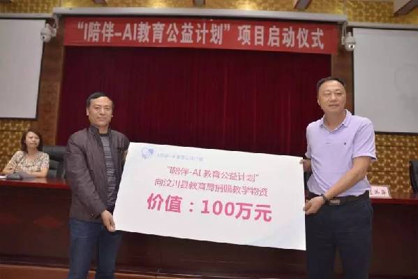 活动上,“I陪伴—AI教育公益计划”项目组委会向汶川中学、汶川一小捐赠价值100万元的教学设备及人工智能产品,科大讯飞股份有限公司向团中央社会联络部捐赠价值1000万元项目物资。