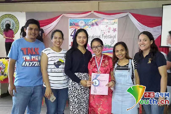 郭妍(左三)的菲律宾学生(右三)获得了全菲(宿务七区)中学生外语才艺大赛汉语比赛唱歌环节第一名。本人供图