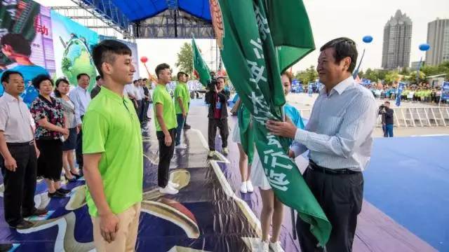赵建才为“环境宣传倡导志愿者”、“环境信息监测志愿者”、“环境执法督导志愿者”、“环境先锋模范志愿者”青年服务队分别授旗。