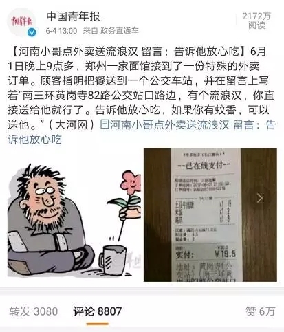 后来,张学栋找来蚊香,又加送了一份汤,委托一个外卖小哥给流浪汉送去了。被这份订单打动的张学栋,把订餐留言拍照发到了朋友圈,许多同事和朋友看到后纷纷点赞,“世上还是好人多”。