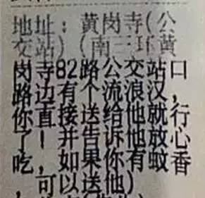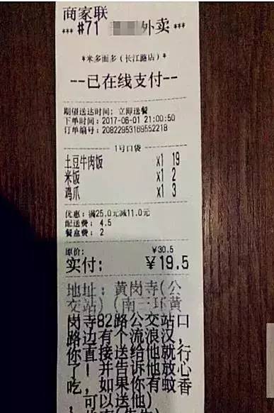 一名顾客点了一份土豆牛肉饭、一份米饭、一个鸡爪。不过,顾客指明要把餐送到一个公交车站。这让张学栋有些奇怪,他还是第一次接到这样的订单。仔细一看订单上的留言,他瞬间被上面的几行字打动了。 留言上写道:“南三环黄岗寺82路公交站口路边,有个流浪汉,你直接送给他就行了。告诉他放心吃,如果你有蚊香,可以送他。”