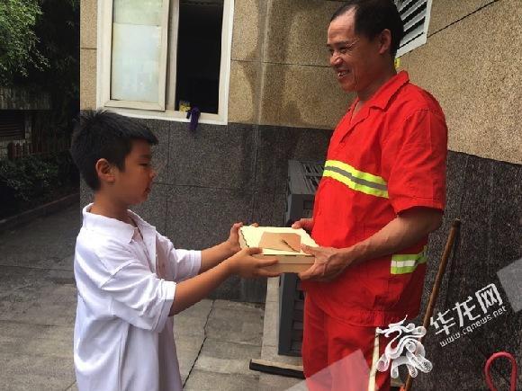 到达观音桥后,8岁的墙镪拿着那份“藏宝座”,递给了陈志军。这位50岁的环卫工有点不知所措,接过便当连声道谢。