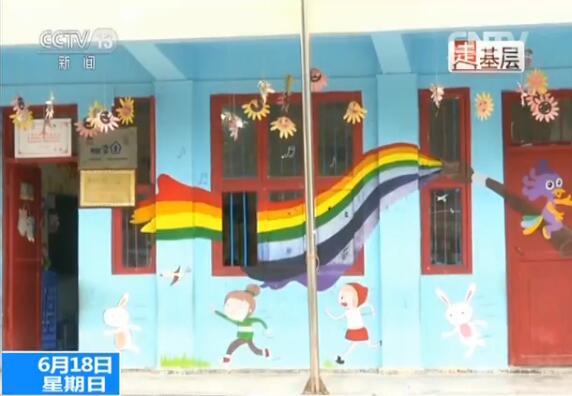为了打开孩子们贫瘠封闭的精神世界,两个姑娘首先从改造环境入手。她们在童园三间教室的外墙涂刷了蓝色天空和彩虹图案,走廊上面钉了可爱的太阳花挂饰,教室的四面墙壁都进行了装饰,就连天花板上都没有放过。