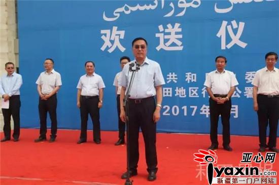 地委副书记、行署专员艾则孜·木沙致辞。他说,促进城乡富余劳动力转移就业,是推进和田脱贫攻坚的重要渠道和关键举措,长期以来,党中央、自治区党委心系和田人民,相继出台了一系列优惠政策和举措,为各族人民群众走出去就业创造了前所未有的机遇和条件,这充分体现了党中央、自治区党委对南疆富余劳动力转移就业工作的高度重视和特殊关怀。他希望大家珍惜眼前的机会,牢固树立“总目标”意识,铭记党恩,遵纪守法,勤劳致富,争做维护稳定的模范,民族团结的模范,做爱岗敬业的模范,努力打造“和田劳务输出”品牌,树立和田人民的良好形象,用勤劳和汗水实现自己的增收梦、致富梦、幸福梦。