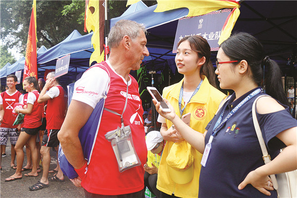 高二学生杨千越(右二)作为翻译,其翻译能力和心理素质得到外国龙舟队领队的称赞。