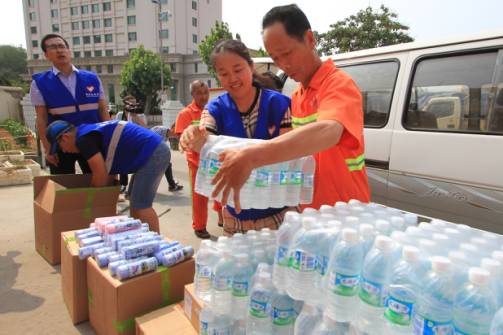 活动前期,威海团市委通过微博、微信等新媒体,向社会发出“爱心募集令”,向青企协会员单位及其他爱心企业广泛募集爱心水杯、爱心毛巾、矿泉水等物品;同时发动各临街商铺等社会力量结合自身特点为环卫工人、交警等群体临时增设休憩站、纳凉点,并在休憩站点提供饮用水、休息座椅等。倡议书发起后,得到了爱心企业的积极响应,先后有水务集团、福缘爱家居用品、威海地税局、山东燕喜堂、威海非鱼莫蜀餐饮有限公司、锦上花糖酒、拓商集团等爱心单位报名参与,共募集了455箱矿泉水、1000多条毛巾、300个水杯、200盒藿香正气水、100瓶风油精等降暑物资。