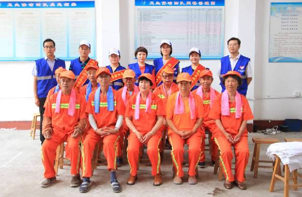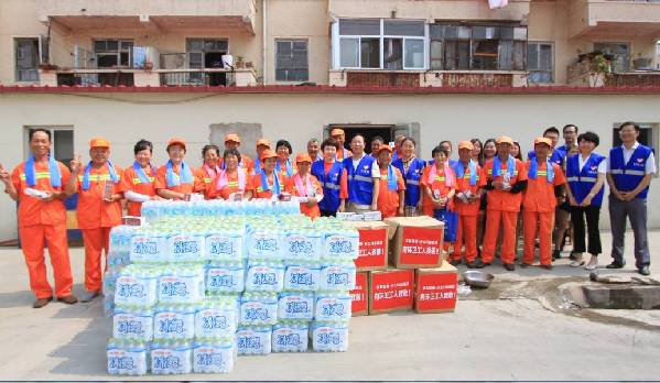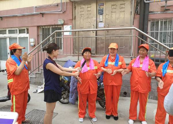 志愿者们先后来到万福山庄、四方路、望海园3个环卫工作站,看望环翠区环卫工人。福缘爱家居用品有限公司总经理孙艺玲现场为环卫工人演示冰爽毛巾的使用方法,降温效果得到环卫工人的一致认可。乡土川渝酒店总经理李建中得知此项活动后,抓紧订制了300个水杯,分发到环卫工人手中。山东燕喜堂的志愿者为环卫工人提供了降暑药品。威海地税局、水务集团、锦上花糖酒、拓商集团的志愿者们捐助455箱矿泉水,并表示根据需要还可以为环卫工人提供更多爱心物资,继续参与到志愿服务中来。