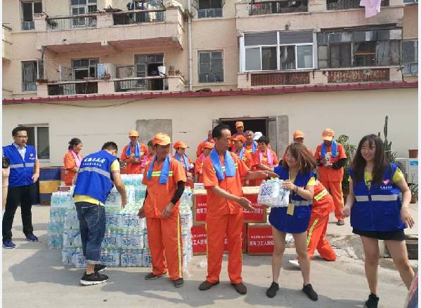近日,环翠区环卫工人收到了一份特殊的礼物。威海市志愿者协会组织爱心志愿者为工作在一线的环卫工人送去了矿泉水、毛巾、水杯、藿香正气水等防暑物资,受到了环卫工人一致的好评,纷纷竖起了大拇指。