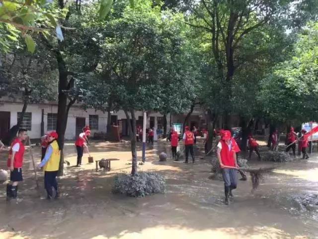 7月2日下午,广西融水团县委在洪水下降的,第一时间组织志愿者来到受灾现场。 志愿者们与干部群众一起除积水、清淤泥。