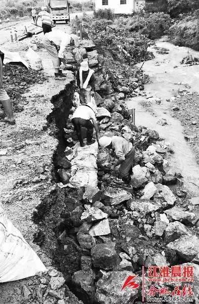 安庆被山洪冲毁的道路,工作人员正在进行抢修