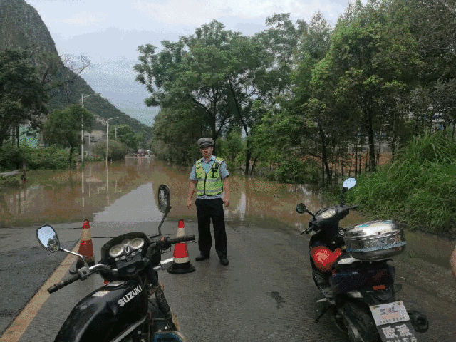 城中大队河东中队对大雨过后环江滨水大道进行巡逻巡查,并对塌方路段设置警戒。▲