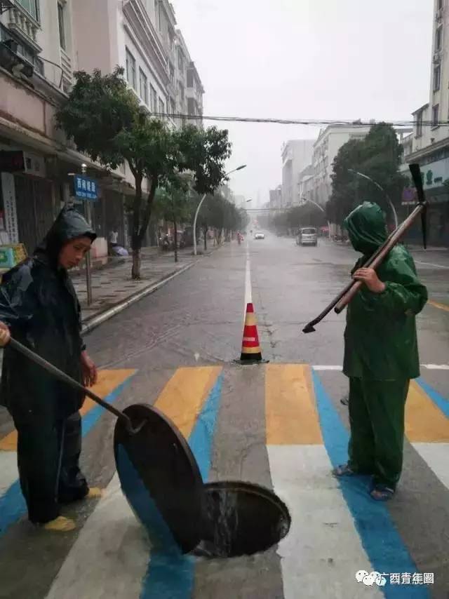 ▲为了加速排水,市政部门派出工作人员打开下水井盖,并放置警示锥筒。