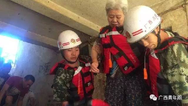 救援人员将新民街138号的一名老人转移到融水大酒店前安全地带,据其女儿唐秀萍介绍,老人今年已经85岁。▲