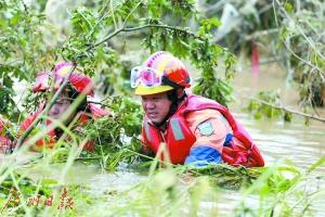 王治勇(右)和队员在洪水中搜救