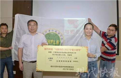 在当天的志愿者行前会上,南京河西外国语学校送来一份 " 厚礼 " ——该校教育基金会捐出 5 万元善款,用于宁夏海原县海城镇远景希望小学未来开展教学工作,并委托快报购买爱心文具、教具、书籍等,随此次支教志愿者一同带去海原,给参加暑期夏令营的当地孩子一个惊喜。