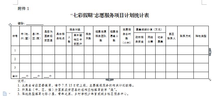 3.及时报送信息。各省级团委填写《“七彩假期”志愿服务项目计划统计表》(附件1),各服务地点填写《“七彩假期”志愿服务项目信息登记表》(附件2),于7月15日前报送团中央青年志愿者行动指导中心。各省级团委填写《“七彩假期”志愿服务项目信息统计表》(附件3),于9月10日前报送团中央青年志愿者行动指导中心。